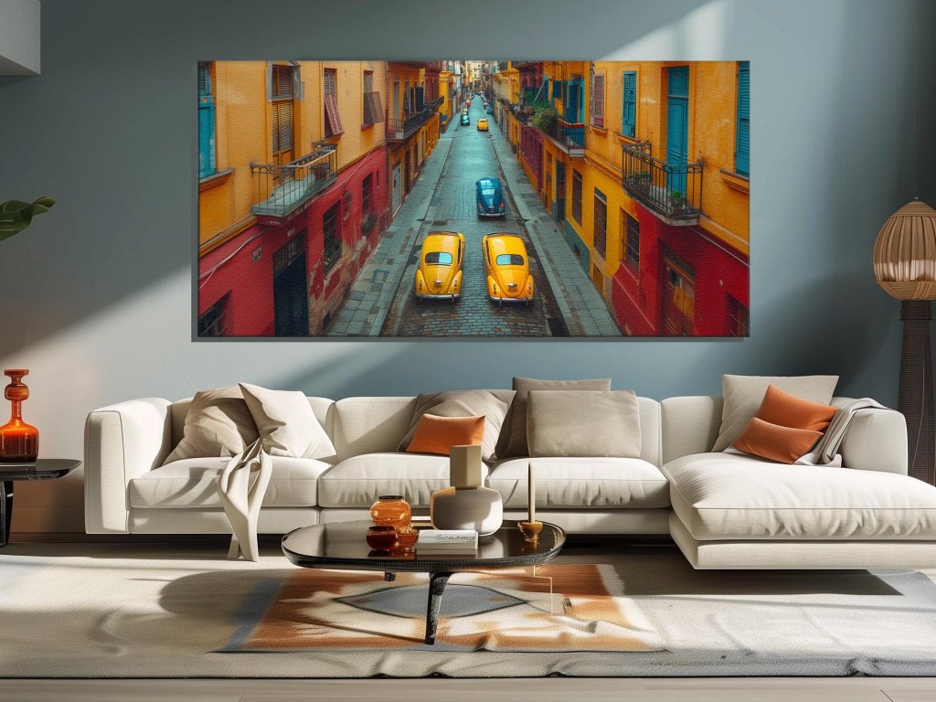 Historická, zámková dlažba tvorí cestu cez živé a farebne odlíšené fasády domov, s dvojicou žltých áut, ktoré oživujú scénu. Balkóny s kovanými zábradliami a uzavreté okenné okenice pridávajú obrazu európsky charakter, zatiaľ čo svetelná paleta podčiarkuje pocit pokoja a ticha v ranných hodinách.