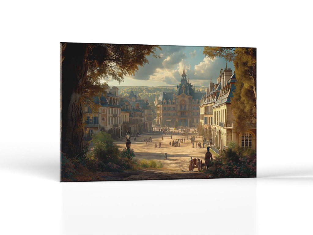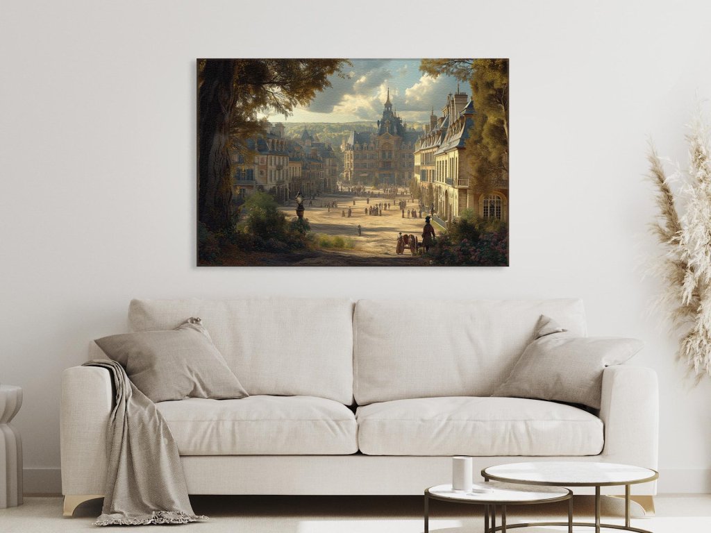 Na obraze je vidieť mesto v teplom, slnečnom svetle, ktoré zdôrazňuje bohatú architektúru klasicistných budov s výškovými bodmi a komínmi. Občania v dobovom oblečení sa prechádzajú alebo stoja v skupinkách na kamennej dlažbe námestia. Kompozíciu obrazu dopĺňajú mohutné stromy a kvitnúce kríky v popredí, čo pridáva scéne nádych romantizmu a pokojnej atmosféry.