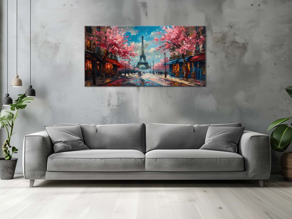 Tento obraz zachytáva romantickú atmosféru Paríža v plnej jarnej nádhere s ružovo kvitnúcimi stromami a pohľadom na Eiffelovu vežu. Na obraze dominuje živá paleta farieb, ktorá oživuje scénu a pripomína sviežosť jarnej obnovy. Kaviarne pozdĺž ulice a prechádzajúci ľudia dodávajú scéne dynamiku a autentický mestský pulz.