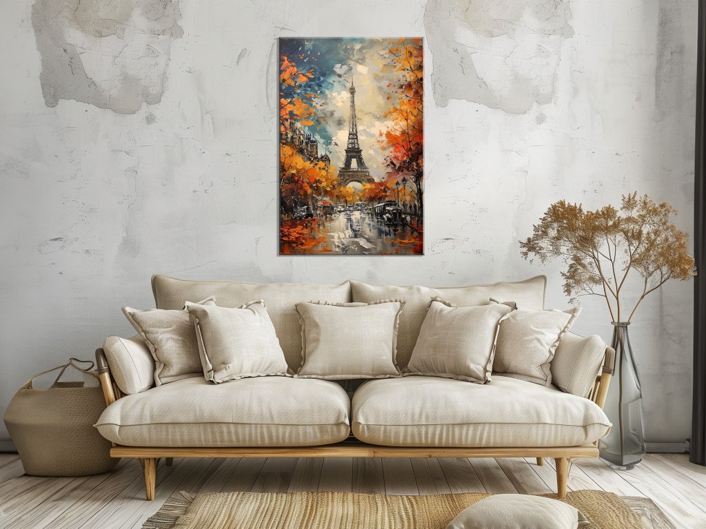Tento obraz zobrazuje krásnu jesennú scénu v Paríži, kde Eiffelova veža majestátne dominuje nad mestom. Stromy pokryté farebným lístím obklopujú ulicu, ktorá je plná historických budov a starých vozidiel, čím vytvára nostalgickú atmosféru. Umelcova technika zachytáva živé farby jesene a jemné detaily parížskej architektúry, čo pridáva obrazu romantický a melancholický nádych.