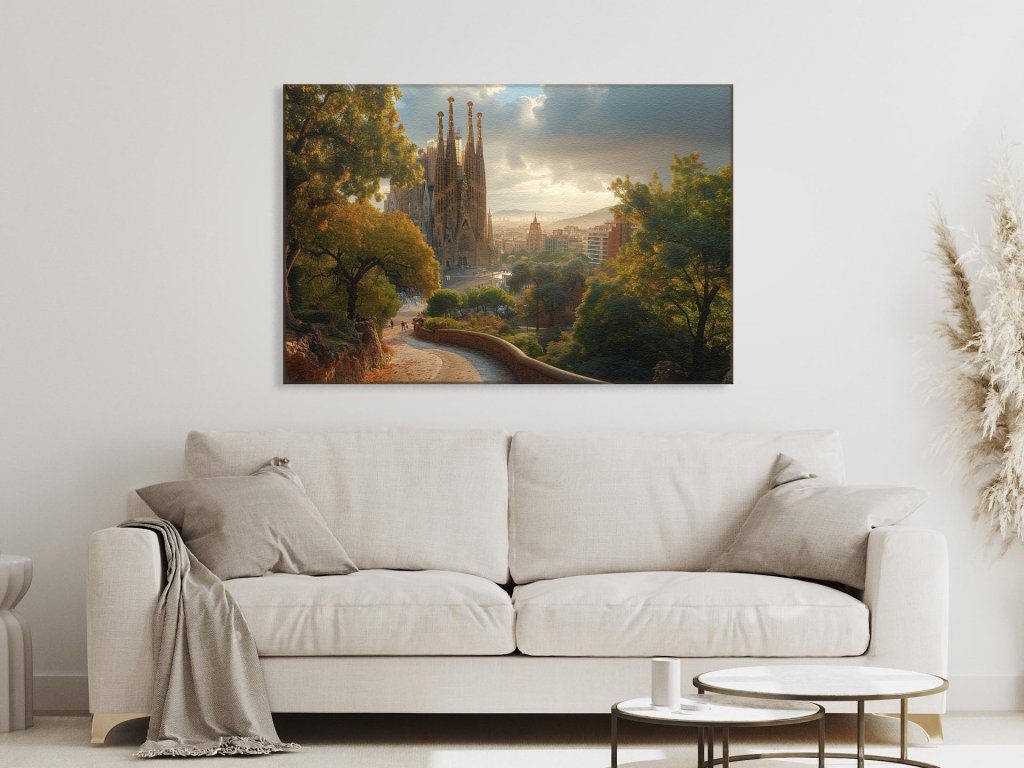 Obraz zobrazuje ikonickú Sagradu Famíliu obklopenú jesenným lístím pod žiarivým svetlom zapadajúceho slnka. Zelené parky a živý mestský ruch Barcelony sú zachytené v mäkkom svetle, ktoré dodáva scéne tajomnú atmosféru. Stopy ľudí na chodníku pridávajú obrazu pocit života a dynamiky.