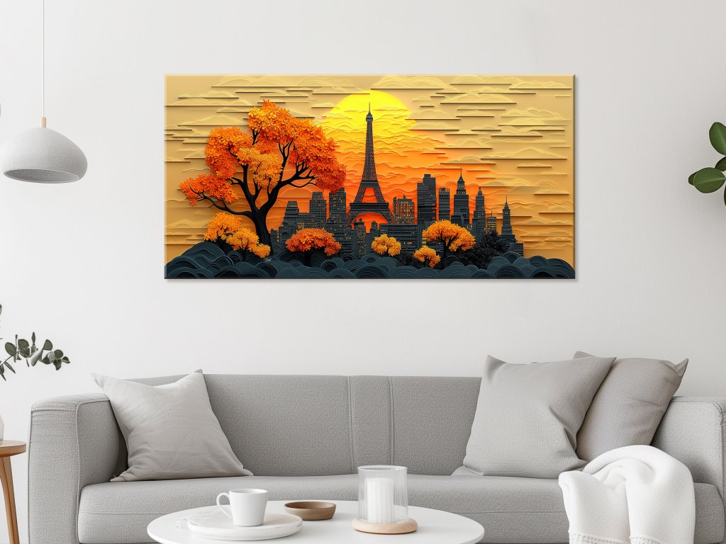 Obraz zobrazuje ikonickú panorámu Paríža, kde v popredí dominuje Eiffelova veža obklopená modernými budovami. V popredí sú umiestnené nádherné stromy s oranžovo-zlatými listami, ktoré naznačujú príchod jesene. Celá scéna je zahalená v teplých farbách západu slnka, čo vytvára atmosféru pokoja a elegancie, typickú pre Paríž.