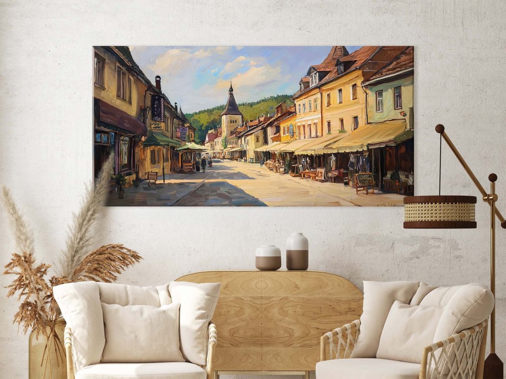 Obraz zachytáva pokojný trh v malom mestečku s obchodmi a ľuďmi prechádzajúcimi sa po slnkom zaliatej ulici. Farby fasád budov sa odrážajú v teplom svetle, ktoré dodáva celej scéne atmosféru letného pokoja a pohody. V pozadí sa týči kostolná veža, ktorá dopĺňa malebnosť tejto scény vidieckeho života.