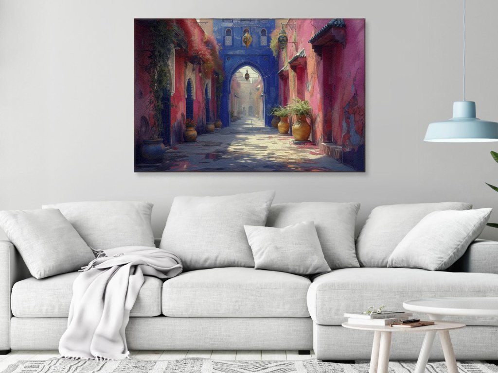 Tento obrázok zachytáva pohľad na pokojnú marockú uličku zdobenú živými farbami a tradičnými prvkami. Ružové a modré steny sú rozjasnené slnečným svetlom, ktoré prechádza cez architektonické oblúky, zatiaľ čo rad keramických kvetináčov pridáva teplé tóny a zeleň. Steny ožívajú textúrou a odlúpnutou farbou, čo dodáva scéne charakter a hĺbku.