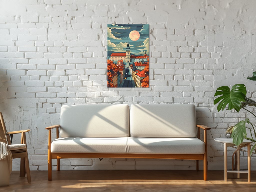 Tento obraz zobrazuje malebné historické mesto s dominantnou vežou a strechami pokrytými červenými škridlami. Na oblohe svieti veľký plný mesiac, ktorý osvetľuje mesto a dodáva mu magický nádych. Ulice sú pokojné, obklopené budovami so starobylou architektúrou, ktoré vytvárajú atmosféru minulých čias.