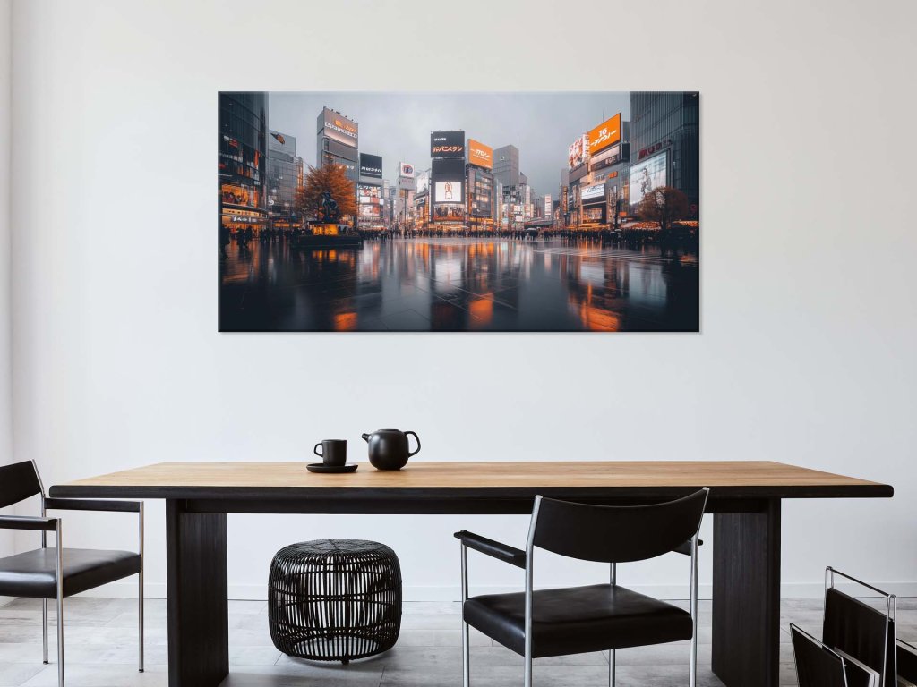 Obraz zachytáva dynamiku mestského života v nočných hodinách, kde svetlá reklám vytvárajú kontrast s tmavou a lesklou dlažbou po daždi. Ľudia kráčajú cez rozľahlé námestie obklopené modernými budovami, ktoré žiaria v rôznych odtieňoch oranžovej a modrej. Atmosféra pôsobí živým a zároveň melancholickým dojmom, pričom odrazy svetiel v mokrom povrchu dodávajú scéne filmovú estetiku.