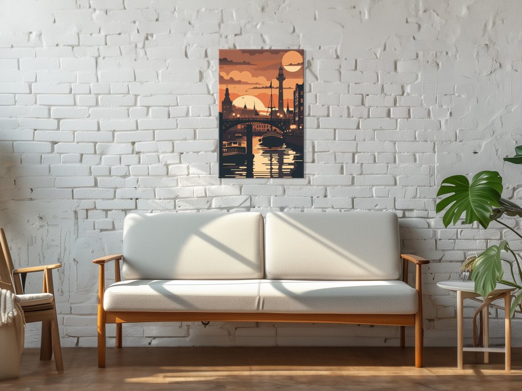 Tento obraz zobrazuje historické mesto pri rieke, kde sa rozžiarené svetlá odrážajú na vodnej hladine. V popredí sa nachádzajú lode a most, ktoré pridávajú dynamiku a hĺbku kompozícii. Na pozadí sú vidieť siluety veží a budov, pričom zapadajúce slnko a mesiac vytvárajú magickú atmosféru súmraku.