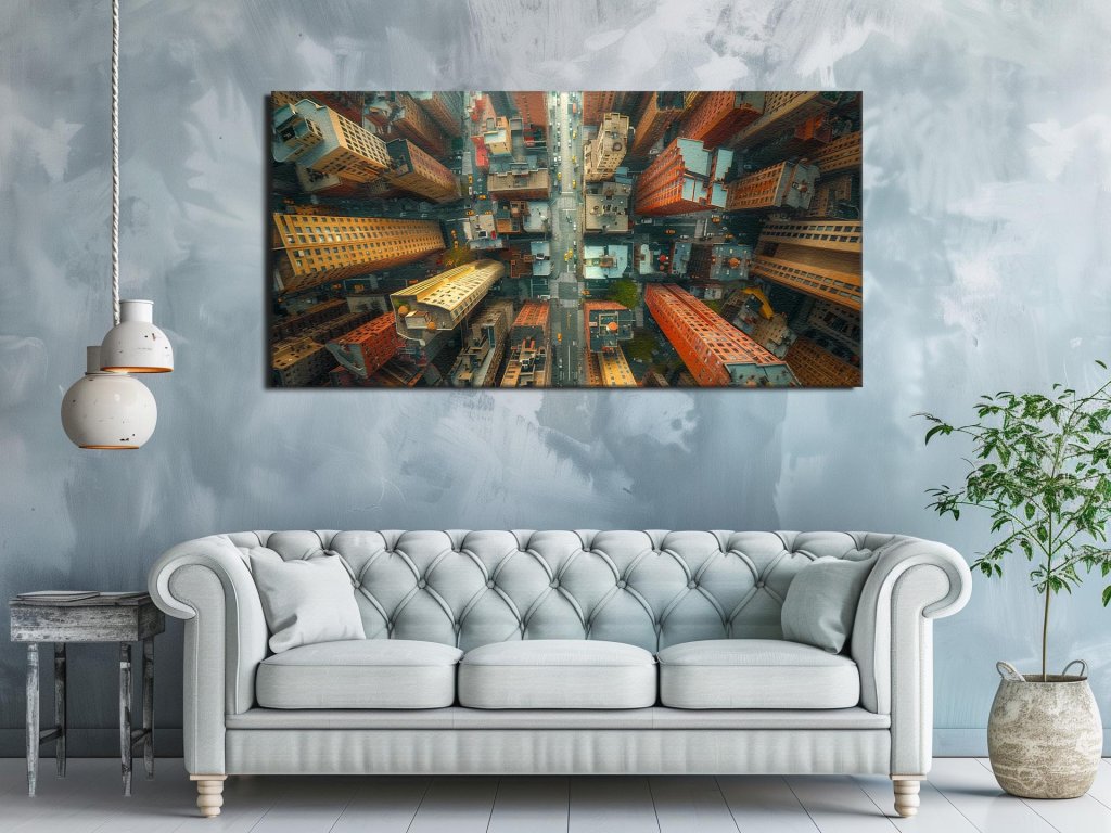 Tento obraz zachytáva mestský križovatku z vysokej, zvislej perspektívy, ktorá vytvára dezorientujúci pocit, akoby budovy a vozidlá boli otočené o 90 stupňov. Surrealistické spracovanie dodáva obrazu snový a nekonvenčný nádych. Hra svetla a tieňov podčiarkuje neobvyklú kompozíciu, zdôrazňujúc dynamiku mestského života.