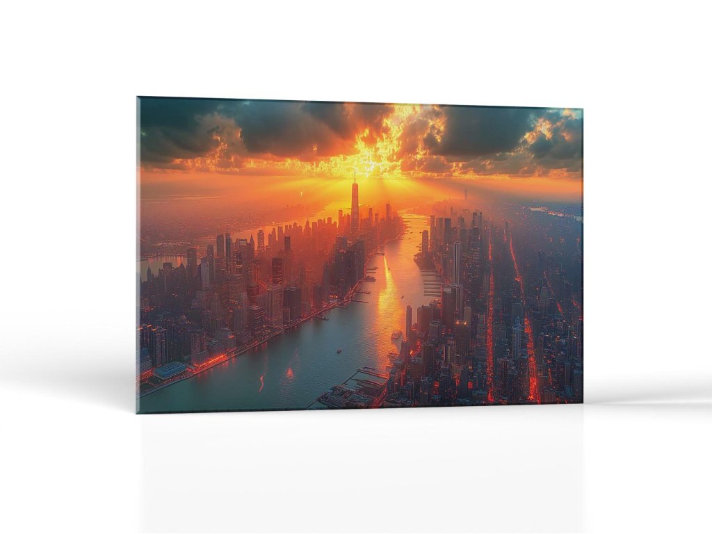 Slnko klesá za horizont, zatiaľ čo jeho posledné lúče osvetľujú mesto a odrážajú sa na rieke, čo vytvára dojem rozžiareného mesta. Vysoké mrakodrapy a dlhé ulice sa lesknú v teplom večernom svetle, zatiaľ čo mesto sa ponára do tichej večernej atmosféry. Táto scéna zachytáva dynamiku mestského života upokojujúcou krásou zapadajúceho slnka.