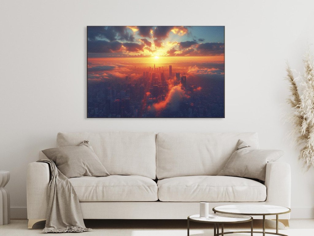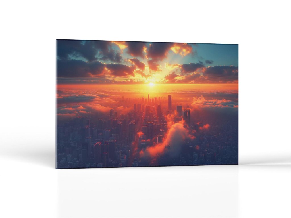 Slnečné lúče prenikajúce cez oblačnú prikrývku osvetľujú horizont a vytvárajú dramatický záber na mesto. Oblaky a mraky sa tvarujú do ohnivých odtieňov, zatiaľ čo nižšie časti sú stále skryté v tieni. Táto hra svetla a tieňov dodáva meste pocit veľkoleposti a tajomstva.