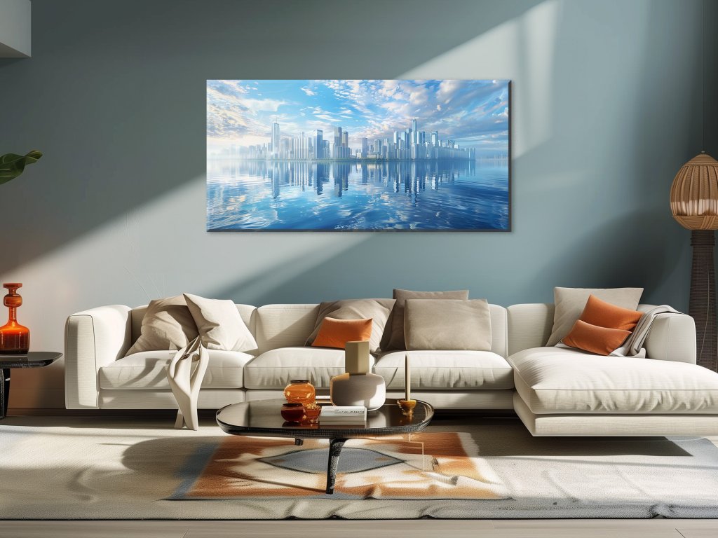 Obraz zobrazuje veľkolepú panorámu moderného mesta s vysokými mrakodrapmi a modernou architektúrou, ktoré sa majestátne týčia nad vodnou hladinou. Jasná modrá obloha s oblakmi a pokojná voda vytvárajú dokonalé zrkadlenie, čím dodávajú scéne pokojný a harmonický vzhľad. Celkový dojem obrazu je futuristický a elegantný, zdôrazňujúci krásu a veľkoleposť mestského prostredia.