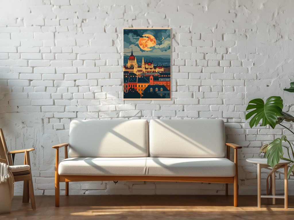 Tento obraz zachytáva pokojnú nočnú scenériu mesta, kde sa historické budovy kúpu v teplom osvetlení. Nad mestom dominuje obrovský mesiac, ktorý osvetľuje oblohu a dodáva celému obrazu mystickú atmosféru. V popredí sú strechy mestských domov, ktoré vytvárajú kontrast s monumentálnymi stavbami v pozadí.