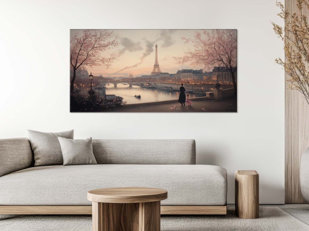 Obraz zachytáva kúzelnú atmosféru Paríža pri západe slnka, keď sa mestské svetlá začínajú odrážať na hladine rieky Seina. Eiffelova veža sa týči v diaľke ako ikonický symbol lásky a elegancie, zatiaľ čo matka s dcérou stojí na nábreží a užíva si tento magický okamih. Rozkvitnuté stromy a historické mosty dotvárajú dokonalú romantickú scenériu hlavného mesta Francúzska.