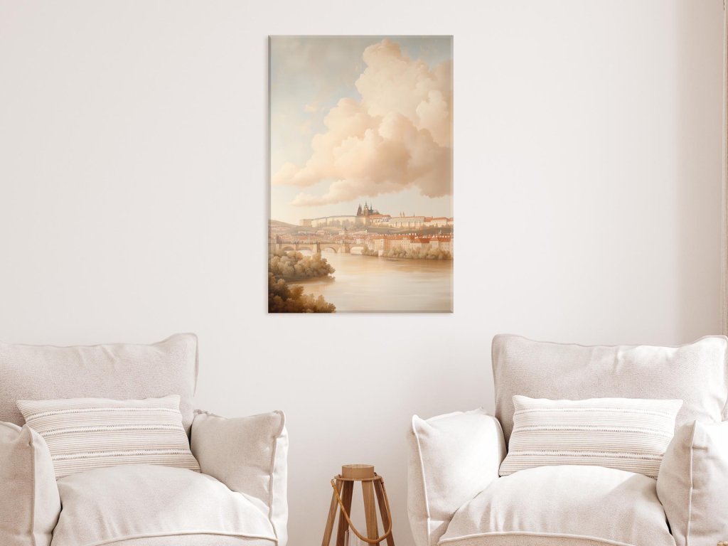 Obraz zachytáva ikonickú panorámu Prahy, kde ticho plynie Vltava popod historický Karlov most a nad mestom sa týči Pražský hrad s katedrálou sv. Víta. Nežné farby a mohutné oblaky nad mestom vyvolávajú dojem mieru a nadčasovosti. Celá kompozícia pôsobí ako sen, ktorý spája minulosť s pokojom prítomného okamihu.