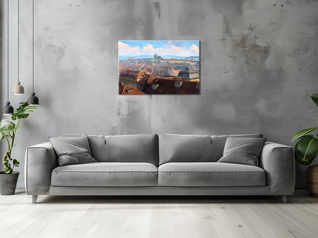 Obraz zachytáva nádherný panoramatický výhľad na historické centrum Prahy, kde sa majestátne týči Pražský hrad. Červené strechy starobylých budov kontrastujú s modrou oblohou a jemnými oblakmi, ktoré dodávajú scenérii pokojný a harmonický ráz. V pozadí sú viditeľné kopce a ďalšie architektonické skvosty, ktoré spolu vytvárajú nezabudnuteľný obraz jedného z najkrajších miest v Európe.
