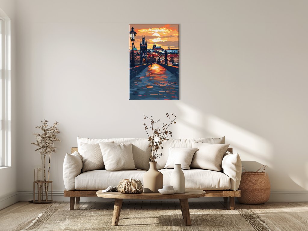 Obraz zobrazuje ikonický Karlov most v Prahe osvetlený teplými farbami zapadajúceho slnka. Most vedie k historickým vežiam a strechám mesta, ktoré sa týčia na obzore. Jemné odrazy slnka na kamenných dlažbách mosta a pokojná atmosféra vytvárajú pocit pokoja a krásy historickej Prahy.