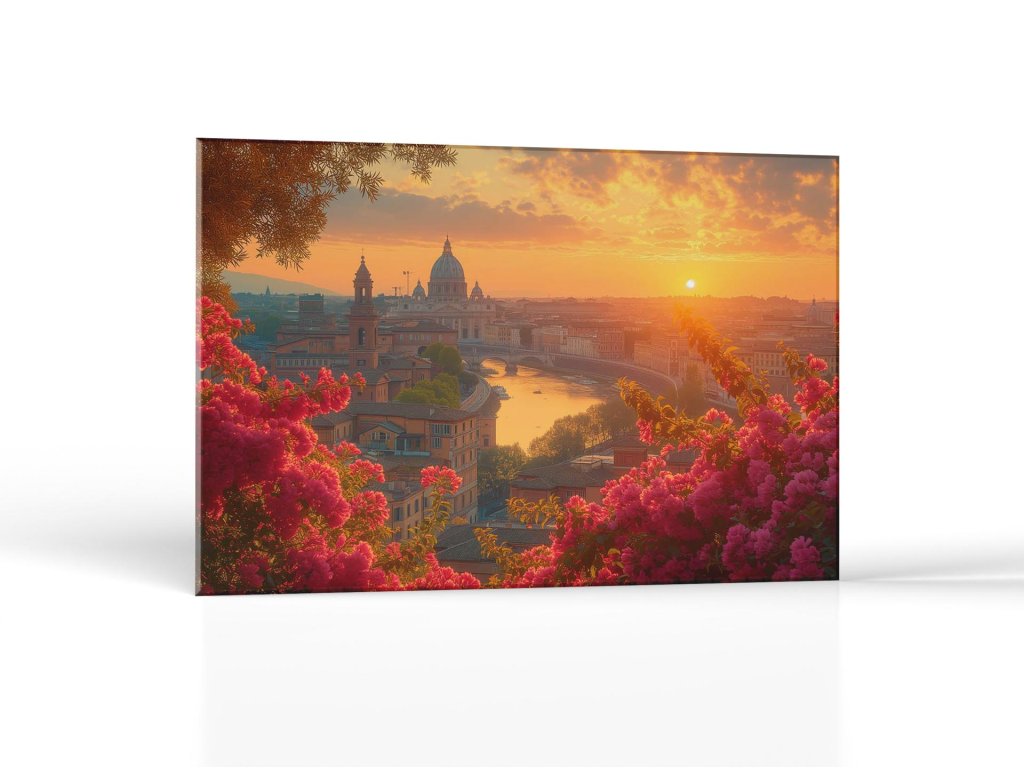Pohľad na rozžiarený Vatikán a rieku Tibera pri východe slnka, s ružovými kvetmi v popredí. Slnko svieti cez mraky a rozlieva teplé farby po oblohe a architektúre, zatiaľ čo mesto pomaly prebúdza do nového dňa. Odrazené svetlo na vode a silueta mesta vytvárajú kľudnú a romantickú atmosféru.