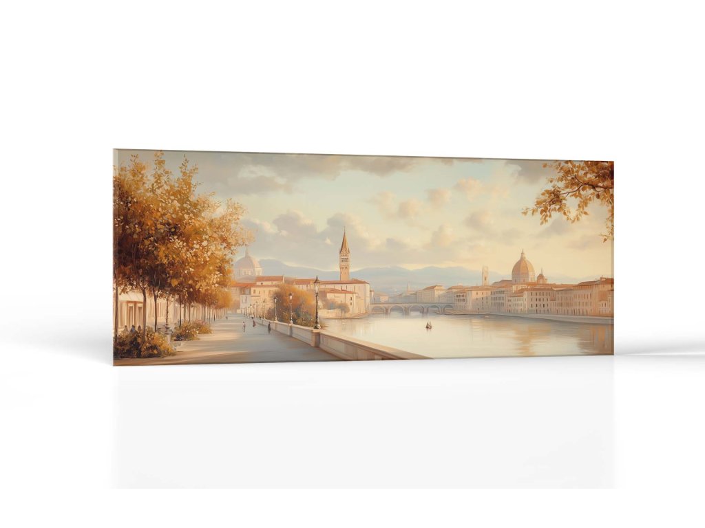 Obraz zachytáva tiché ráno vo Florencii, kde jemné svetlo zaliate zlatými tónmi osvetľuje historické budovy a okolité kopce. Na brehu rieky Arno sa prechádzajú ľudia, zatiaľ čo v diaľke sa črtajú známe pamiatky ako Duomo a starobylé veže mesta. Celkovo pôsobí scéna harmonicky a nostalgicky, pričom odráža čaro tohto talianskeho mesta v jeho pokojnej jesennej atmosfére.