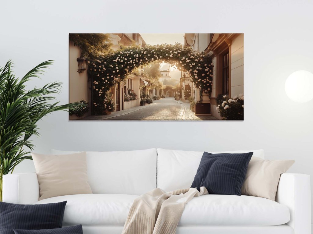 Úzka dláždená ulica je obklopená historickými domami a rozkvitnutými ružami, ktoré vytvárajú klenutý oblúk nad priechodom. Slnečné lúče prenikajú cez zeleň a zalievajú scénu zlatistým svetlom, čím umocňujú atmosféru pokoja a jemnosti. Toto miesto pôsobí ako dokonalý únik pred ruchom sveta a pozýva k pokojnému prechádzaniu a snívaniu.