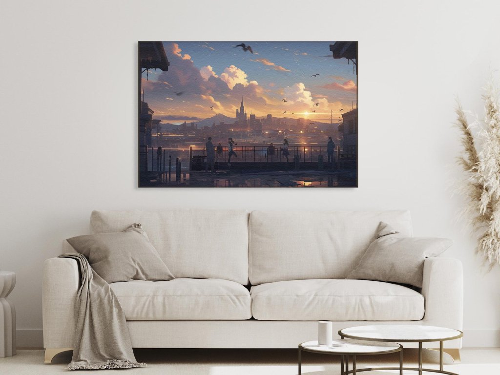Ľudia na streche domu sledujú, ako posledné lúče slnka osvetľujú siluetu mesta. Obloha je rozžiarená teplými tónmi súmraku, a lietajúce vtáky dodávajú scéne pocit slobody a pokoj. Zlatisté svetlo slnka zvýrazňuje kontúry budov a dodáva mestu magickú atmosféru.