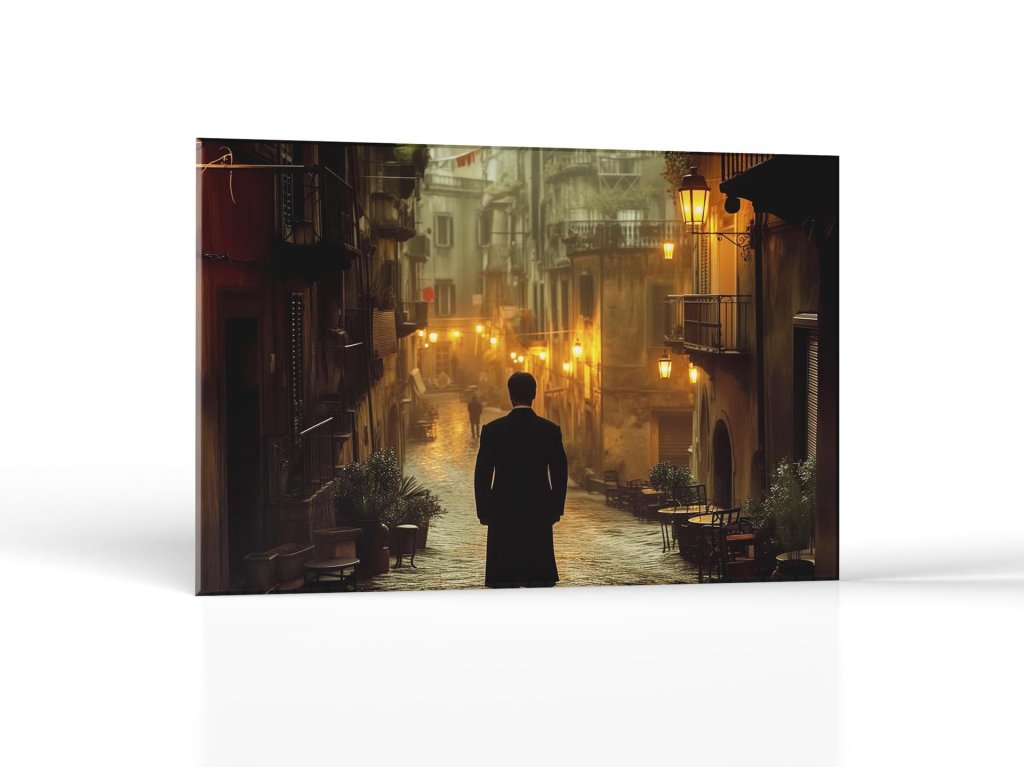 Silueta muža v obleku pozoruje tichú, úzku uličku mestských domov za súmraku, zatiaľ čo žlté svetlá lampášov mäkko osvetľujú priestor. Ulice sú mokré, čo dodáva scéne mierne tajomný nádych. Na oknách niektorých domov svietia svetlá, čo dodáva atmosfére pocit tepla a pohostinnosti.