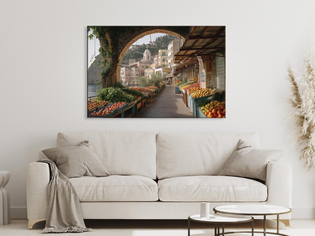 Malebný trh plný čerstvého ovocia a zeleniny je zachytený v popredí s výhľadom na čaro stredomorského mesta. Na pozadí dominuje svah s typickými pastelovými domami a zvonicou, ktoré kontrastujú s pokojnými vodami a skalnatými vrchmi. Scéna je obohatená o detailne vypracovaný oblúk so vzorom a sviežu zeleň, čo dotvára autentickú atmosféru stredomorského pobrežia.