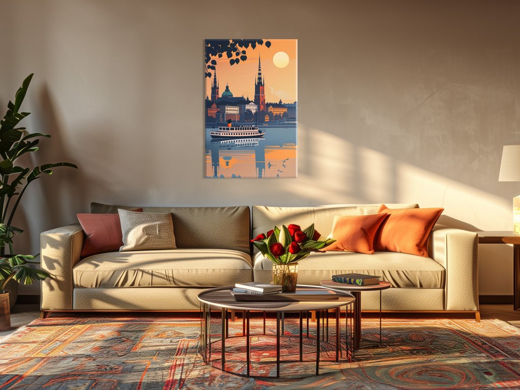 Tento obraz zobrazuje malebné mesto pri rieke, osvetlené jemným svetlom východu slnka. V popredí je vidieť loď, ktorá pokojne pláva po rieke, odrážajúc sa na hladine vody. Na pozadí sa týčia majestátne veže historických budov, vytvárajúc romantickú a pokojnú atmosféru.