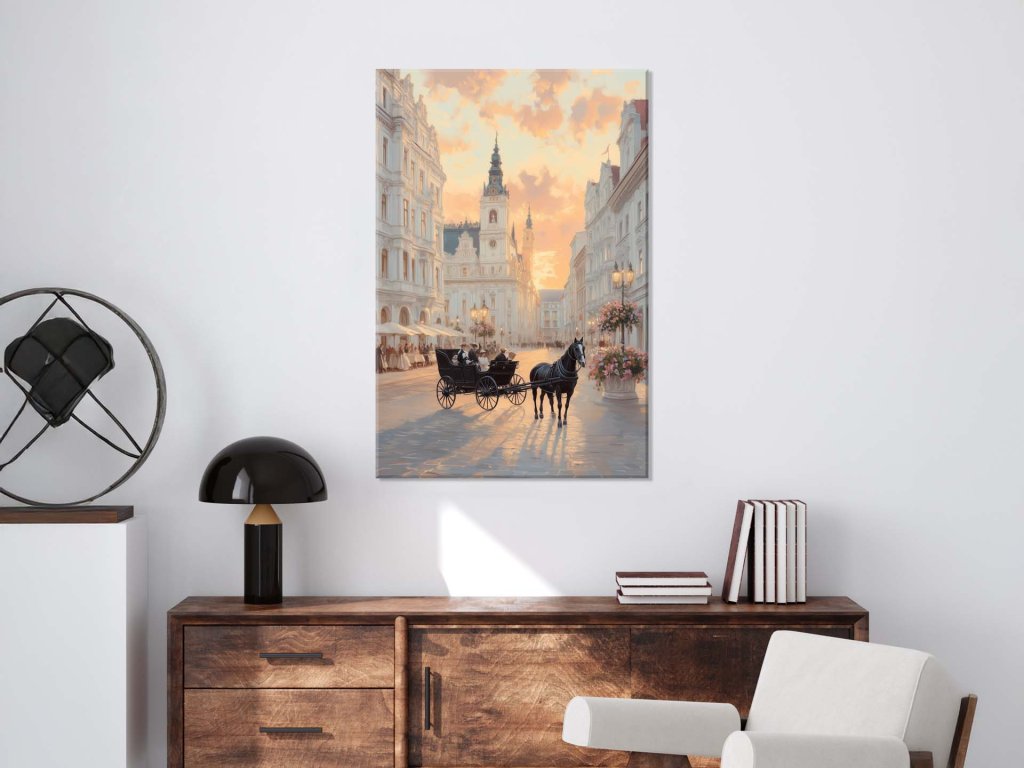 Obraz zachytáva romantickú scénu zo starobylého mesta, kde sa za teplého večerného svetla preváža koč s pasažiermi obklopený majestátnymi budovami. Fasády domov žiaria v odleskoch zapadajúceho slnka, zatiaľ čo ulice lemujú kvetinové aranžmány a lampy s jemným svetlom. Celý výjav pôsobí nostalgicky, akoby sa zastavil čas a mesto sa ponorilo do elegantnej atmosféry minulého storočia.