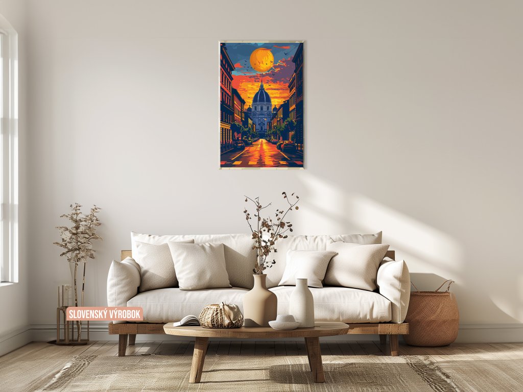Na obraze je zobrazená majestátna katedrála, ktorá dominuje v pozadí ulice plnej zaparkovaných áut a stromov. Západ slnka vytvára nádherné farebné odtiene na oblohe, ktoré sa odrážajú na fasádach budov a na mokrom asfalte ulice. Atmosféra obrazu je pokojná, pričom vtáky na oblohe a teplé osvetlenie pridávajú scéne romantický nádych.