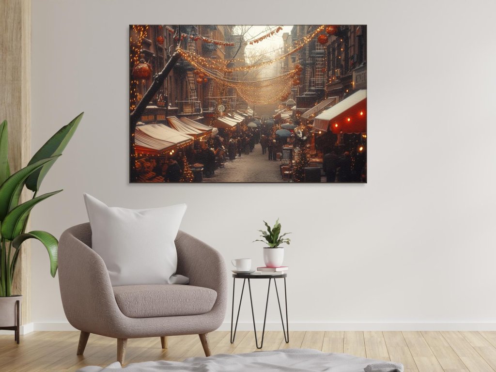 Ulica ožiarená teplým svetlom zavesených reťazí s vianočnými svetlami, vytvárajúca pohľadnicovú scénu. Chodci s dáždnikmi prechádzajú okolo trhových stánkov, a ich kroky v snehu pridávajú k atmosfére zimného večera. Zvuky mesta sú stíšené vrstvami čerstvého snehu a vzdialeným šumením sviatočnej hudby.