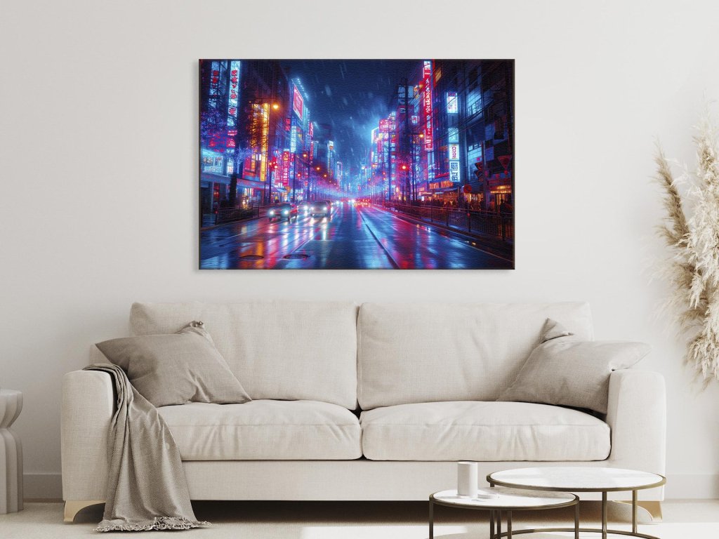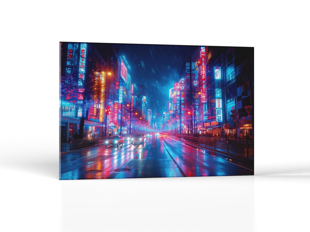 Nočná scéna žiariaca neónovým svetlom a zábleskami automobilových svetlometov na daždivom chodníku. Ulica plná dynamiky a mestského života, obklopená svetelnými reklamami a značkami. Mihotajúce sa kvapky dažďa pridávajú obrazu atmosféru a hĺbku.