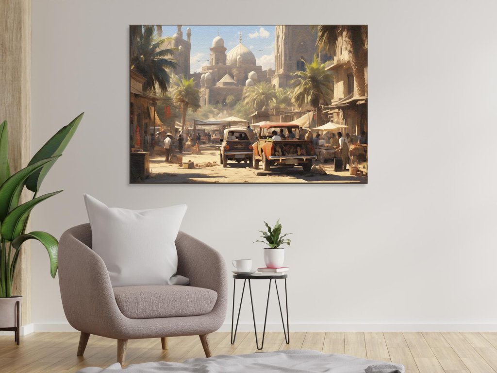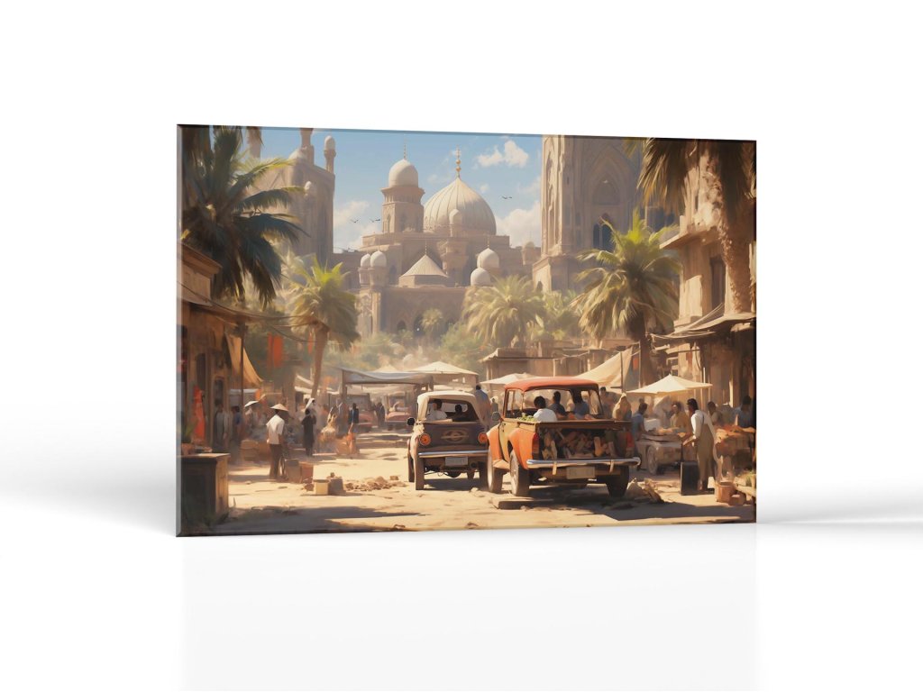 Tento obraz zachytáva oživenú atmosféru v starom orientálnom meste s hustým davom ľudí a starými vozidlami. Majestátne minarety a kupoly sa vypínajú nad palmami a tradičnými trhoviskami, čo pridáva k scéne pocit historického a kultúrneho bohatstva. Mäkké slnečné svetlo a tienisté plochy dotvárajú dojem príjemného prostredia.