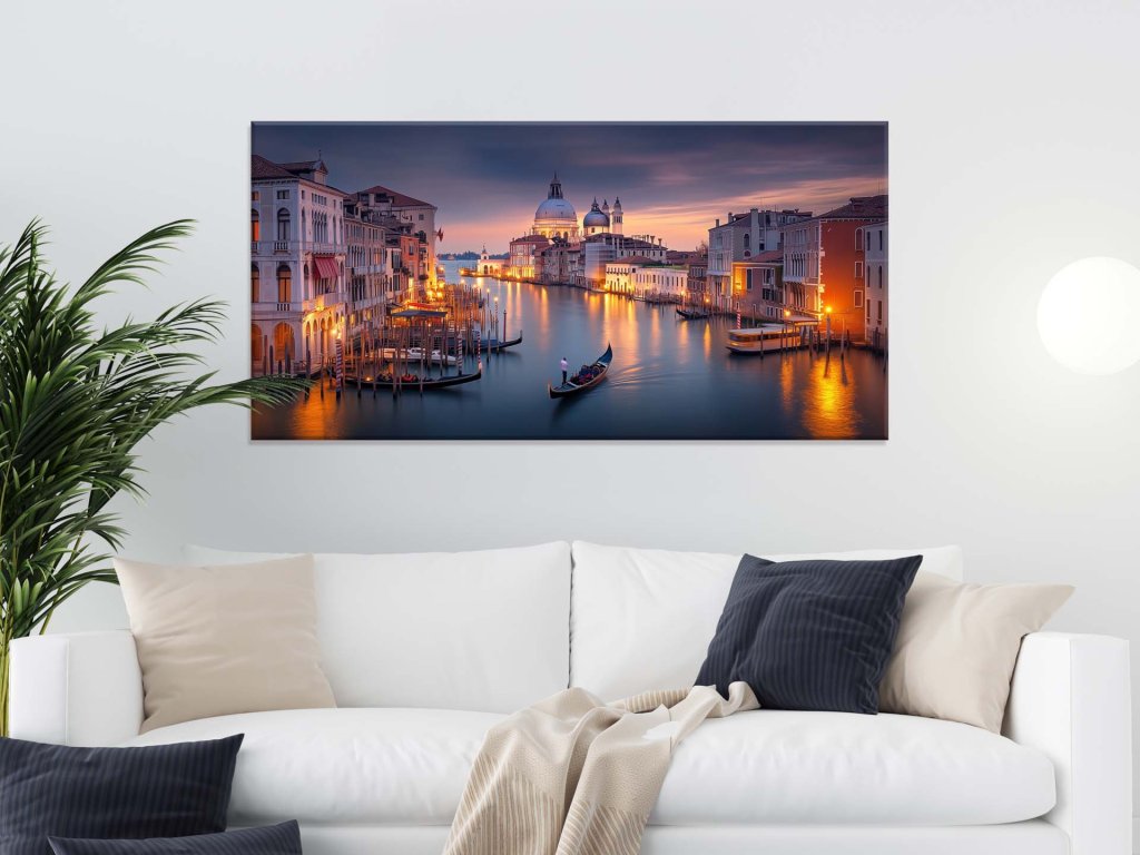 Obraz zobrazuje romantický večer v Benátkach, kde sa tiché gondoly pomaly kĺžu po kanáli medzi historickými budovami. Zlatisté svetlá pouličného osvetlenia vytvárajú nežné odrazy na vode a zvýrazňujú architektonickú krásu mesta. V pozadí sa majestátne týči bazilika Santa Maria della Salute, ktorá dotvára nezameniteľnú atmosféru tohto talianskeho klenotu.