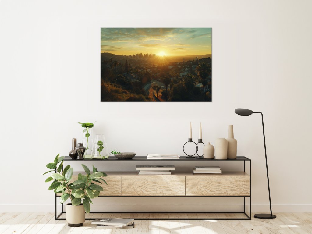 Na obraze je zachytený nádherný západ slnka nad mestom, kde slnečné lúče ožarujú budovy a vytvárajú teplú, zlatistú atmosféru. V popredí sú vidieť svieže zelené stromy a domy, ktoré kontrastujú s modernými výškovými budovami v pozadí. Scéna vyžaruje pokoj a krásu prírody v harmónii s mestským prostredím, pričom zdôrazňuje pokojný večer v rušnom meste.