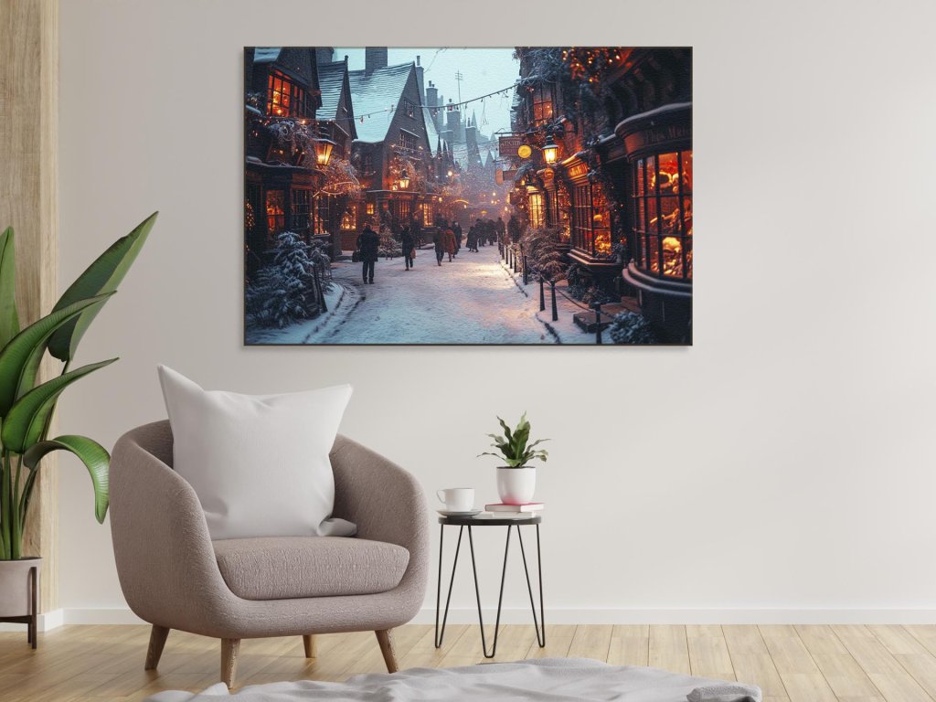 Starobylá ulička osvetlená teplým svetlom lampiónov a vianočných dekorácií, ktoré zdobia priečelia obchodov a tavern, ožíva večerným ruchom. Ľudia v zimných oblečeniach sa prechádzajú po zasneženej dláždenej ceste, zatiaľ čo jemné snehové vločky padajú v súmraku. Atmosféra je plná očakávania a pohody sviatočnej sezóny.