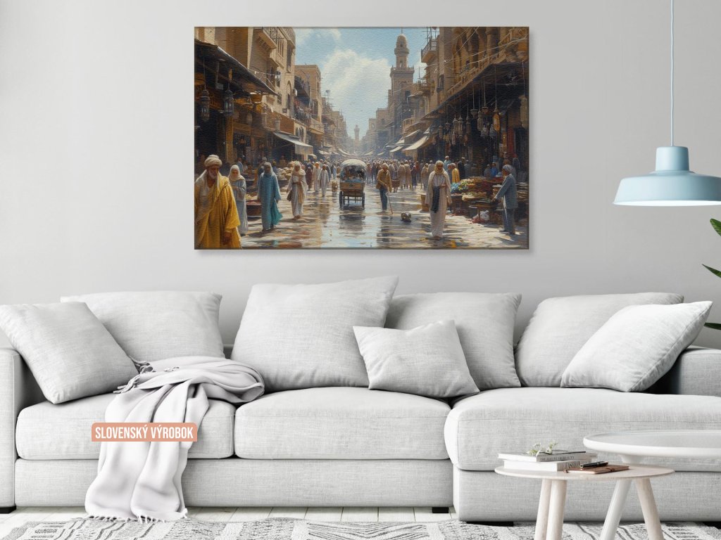 Obrázok zachytáva rušnú atmosféru tradičného trhu s hustým davom ľudí pohybujúcich sa medzi stánkami a obchodmi. Teplé slnečné svetlo zdôrazňuje farby oblečenia predávajúcich a architektonické detaily budov, zatiaľ čo odrazy na mokrej dlažbe pridávajú obrázku hĺbku a textúru. Vzduchom sa nesie zmes vôní korenín a zvuky mestského života.