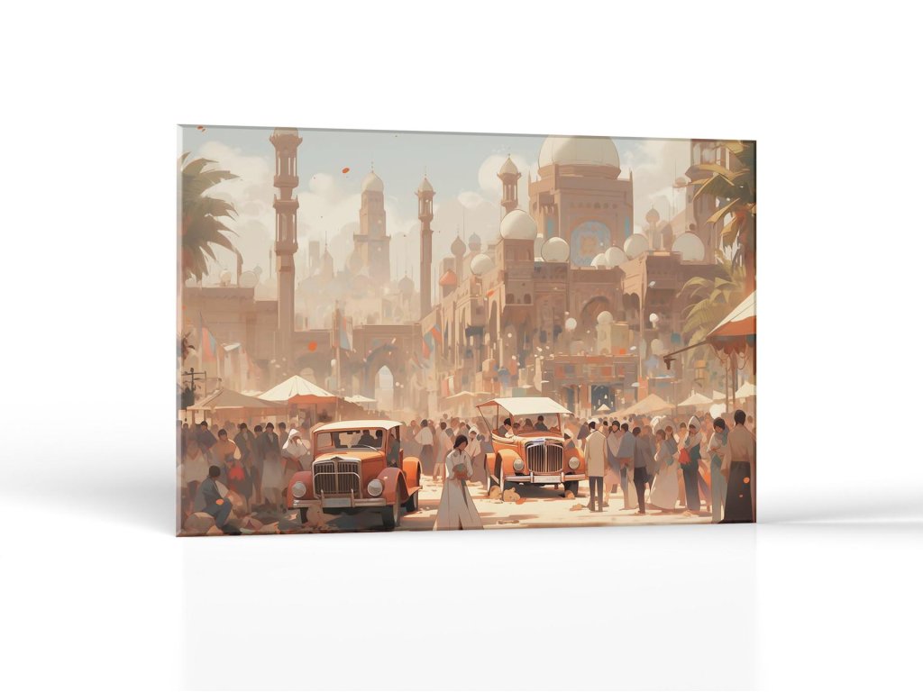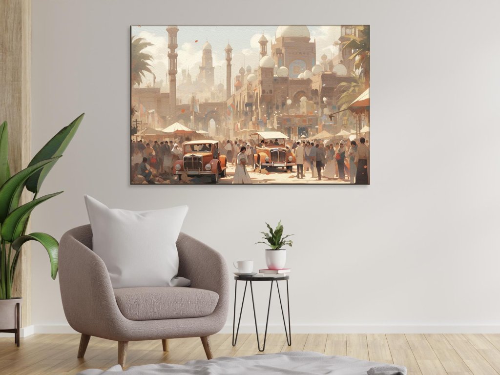Obraz zobrazuje rušný deň v orientálnom meste s minaretmi a kupolami trčiacimi do jasného neba. Starodávne autá a ruch pešej zóny dodávajú scenérii historický pocit, zatiaľ čo ľudia v tradičných šatách dotvárajú atmosféru života vo meste. Slnečné svetlo prenikajúce scénou oživuje farby a tvary na obraze.