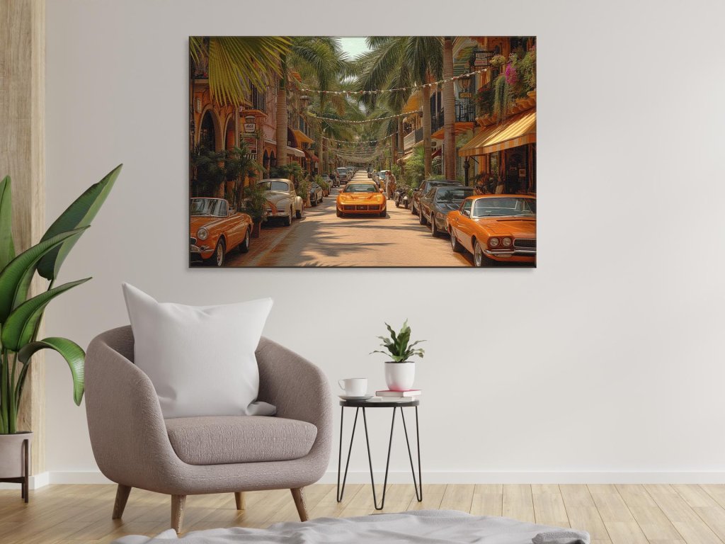 Bulvár ožívajúci farbami a historickými autami, s palmami vytvárajúcimi tienistú alej. Teplé slnečné svetlo dopadá na chodníky a fasády obchodov, zatiaľ čo farebné prúžky a osvetlenie pridávajú scenérii letný nádych. Pohoda a elegancia sú cítiť vo vzduchu, keď sa ľudia prechádzajú alebo sedia v útulných kaviarňach.