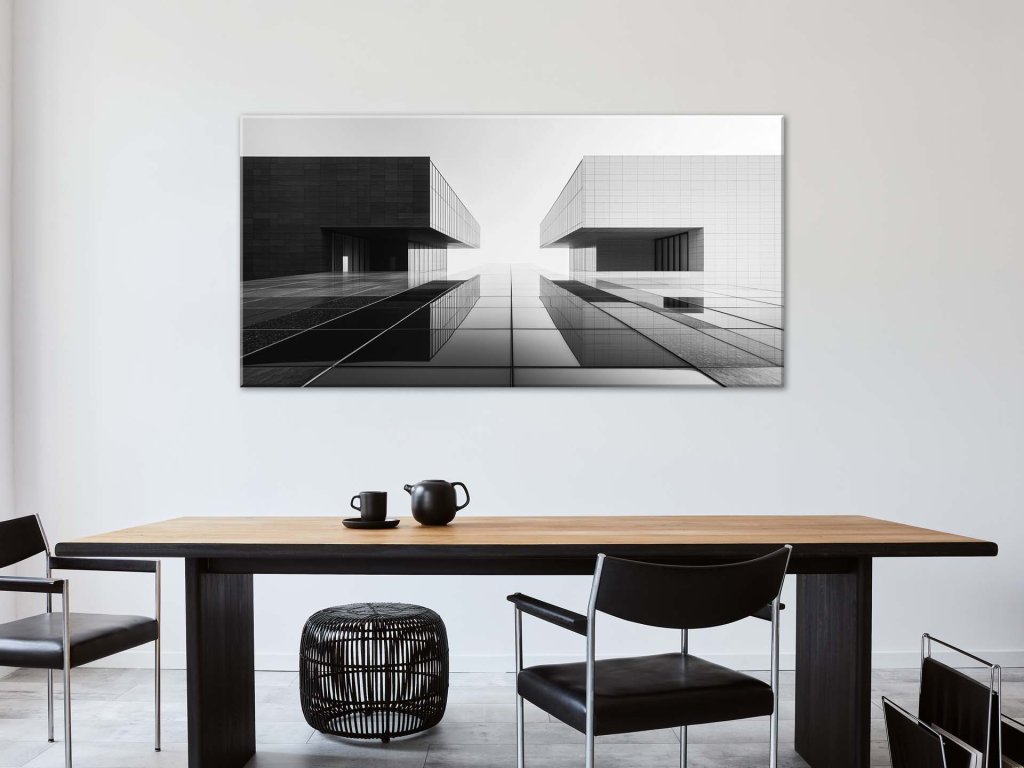 Tento obraz zobrazuje dve moderné budovy, ktoré sa vďaka skleným povrchom elegantne odrážajú na zemi a vytvárajú dojem symetrie. Sústredí sa na presné línie a kontrasty medzi svetlom a tieňom, čím zdôrazňuje futuristický a minimalistický dizajn. Jasné svetlo na pozadí zvyšuje dojem priestoru a nekonečna, čím obraz nadobúda čistý a nadčasový charakter.