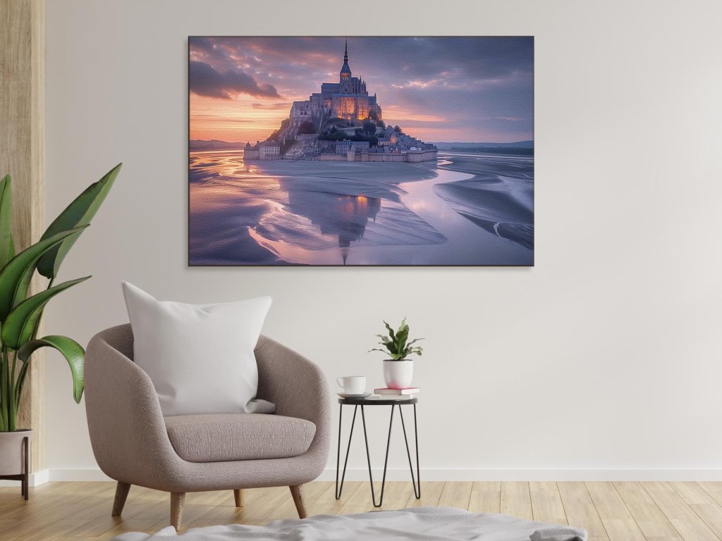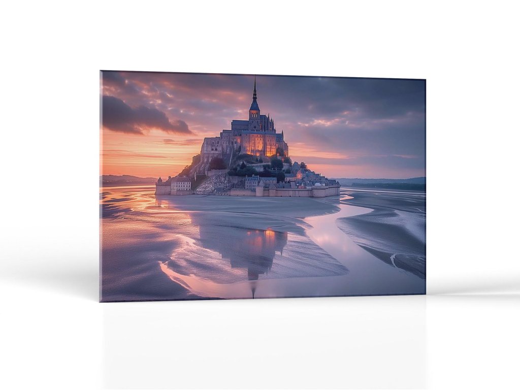 Opevnený stredoveký hrad stojí na ostrove obklopenom plytkými vodami, zrkadliacimi západ slnka. Farebná paleta neba meniac sa od modrej po oranžovú dodáva scenérii magický nádych. Hrad a obklopujúce budovy sú osvetlené, čo vyvoláva atmosféru tajomstva a histórie.