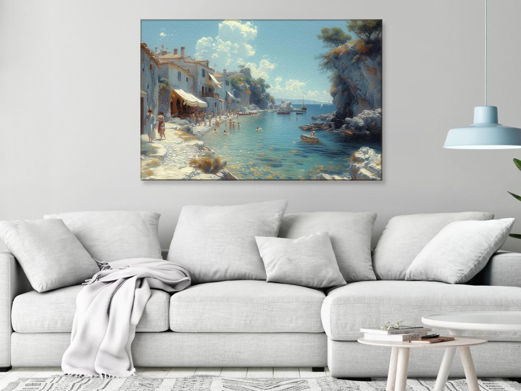 Obraz zachytáva živý prístav s ľuďmi kúpajúcimi sa v krištáľovo čistých vodách, zatiaľ čo iní sa prechádzajú pozdĺž kamenného nábrežia. Kolorit obrazu je jasný a živý, s dominantnými modrými a zlatistými odtieňmi, ktoré evokujú teplé letné svetlo a relaxačnú atmosféru na pobreží.