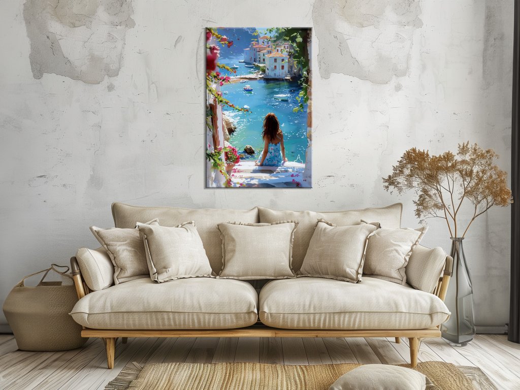 Tento obraz zachytáva pokojný letný okamih, kde žena sedí na schodoch a obdivuje malebné pobrežie stredomorského mesta. Jasné slnečné svetlo osvetľuje krištáľovo čistú vodu, okolo ktorej sú roztrúsené farebné domy a člny. Scéna je obklopená bujnou vegetáciou a kvetmi, čo vytvára atmosféru pokoja a úniku od každodenného zhonu, zdôrazňujúc krásu a pokoj stredomorského života.