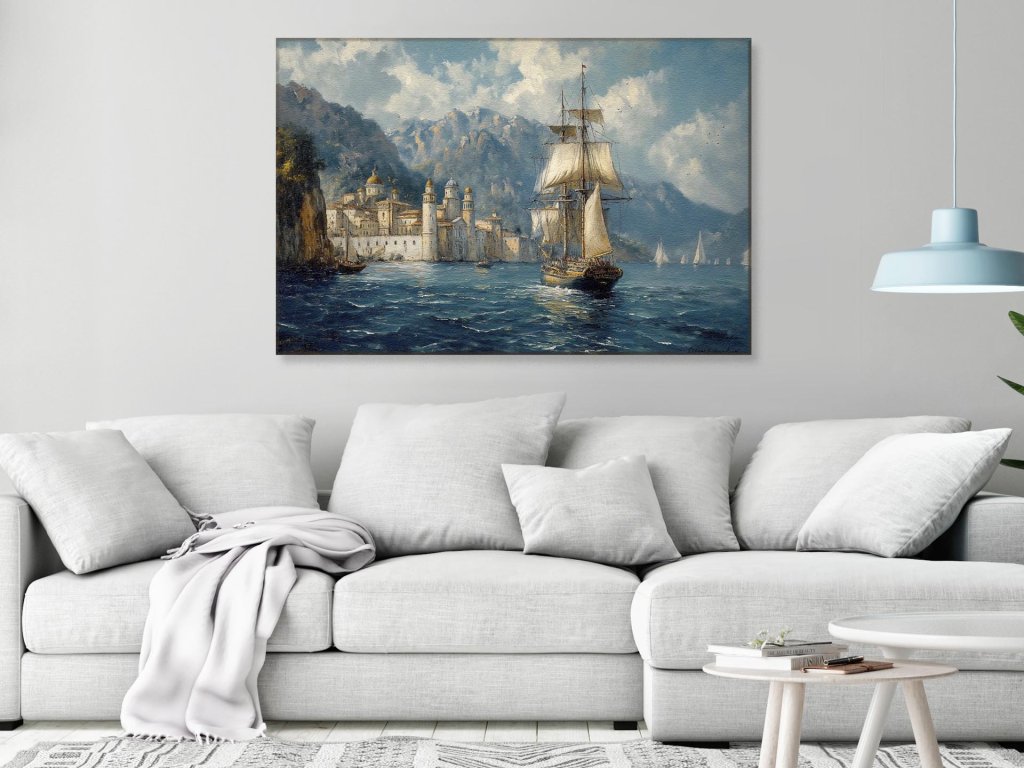 Obraz zobrazuje plachetnicu s rozprestretými bielymi plachtami na modrom mori pred starobylým mestečkom. Mesto je obklopené vysokými skalnatými útesmi a majestátnymi budovami s kupolami a vežami, v pozadí sú vidieť hory. Nebo je jasné s rozptýlenými oblakmi, čo naznačuje krásny deň na mori.
