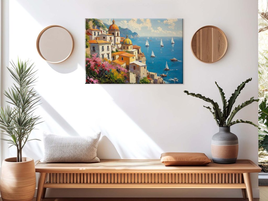 Obraz zobrazuje nádherné prímorské mestečko, ktorého biele budovy s oranžovými strechami sa kaskádovito spúšťajú po útesoch smerom k jasnému, modrému moru. V popredí vidíme živú kvetinovú výzdobu, ktorá oživuje atmosféru a dodáva obrazu sviežosť. Na mori sa plavia plachetnice, ktoré vytvárajú pokojný a romantický dojem, zatiaľ čo nad obzorom sa týči modrá obloha s bielymi oblakmi.