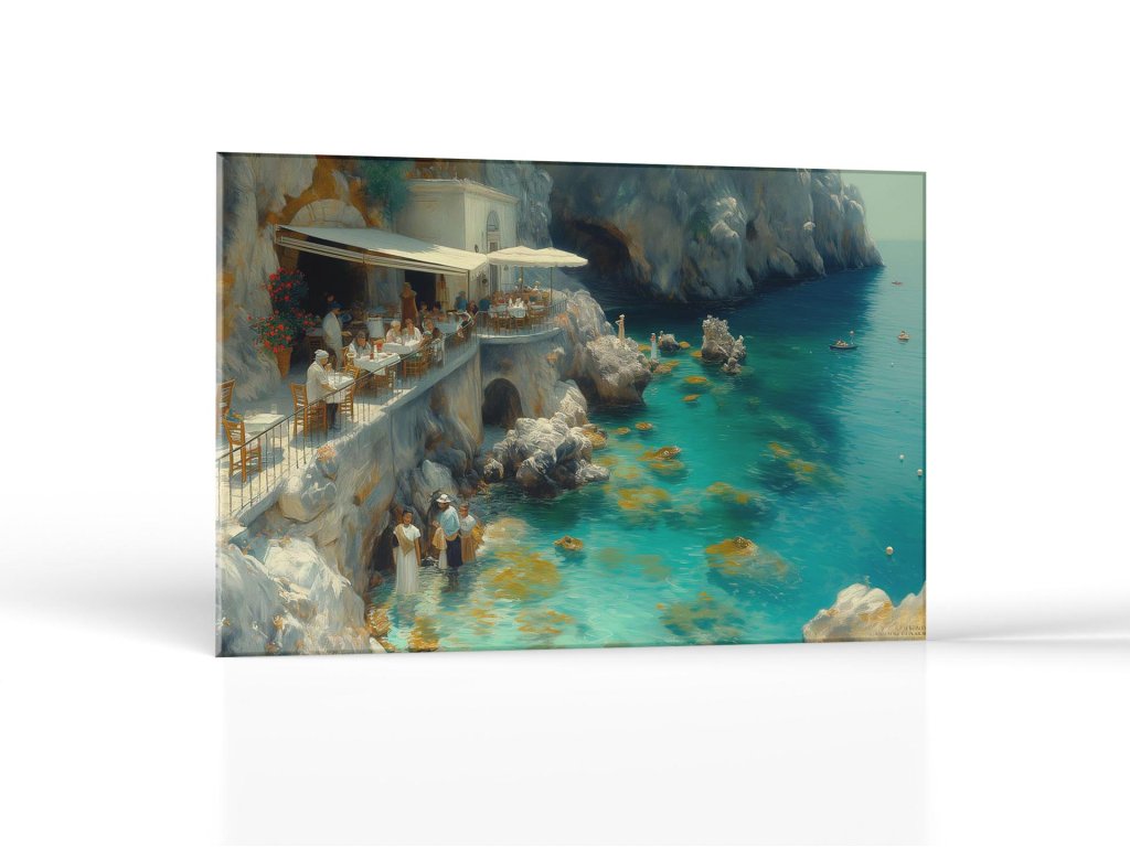 Obraz zachytáva slnečný deň na pobrežnej terase s hostiteľmi a návštevníkmi v bielych odevoch. Skalnaté výbežky a jasne modré more vytvárajú kľudnú atmosféru. V pozadí plávajú malé člny, čo pridáva na malebnosti scenérie.