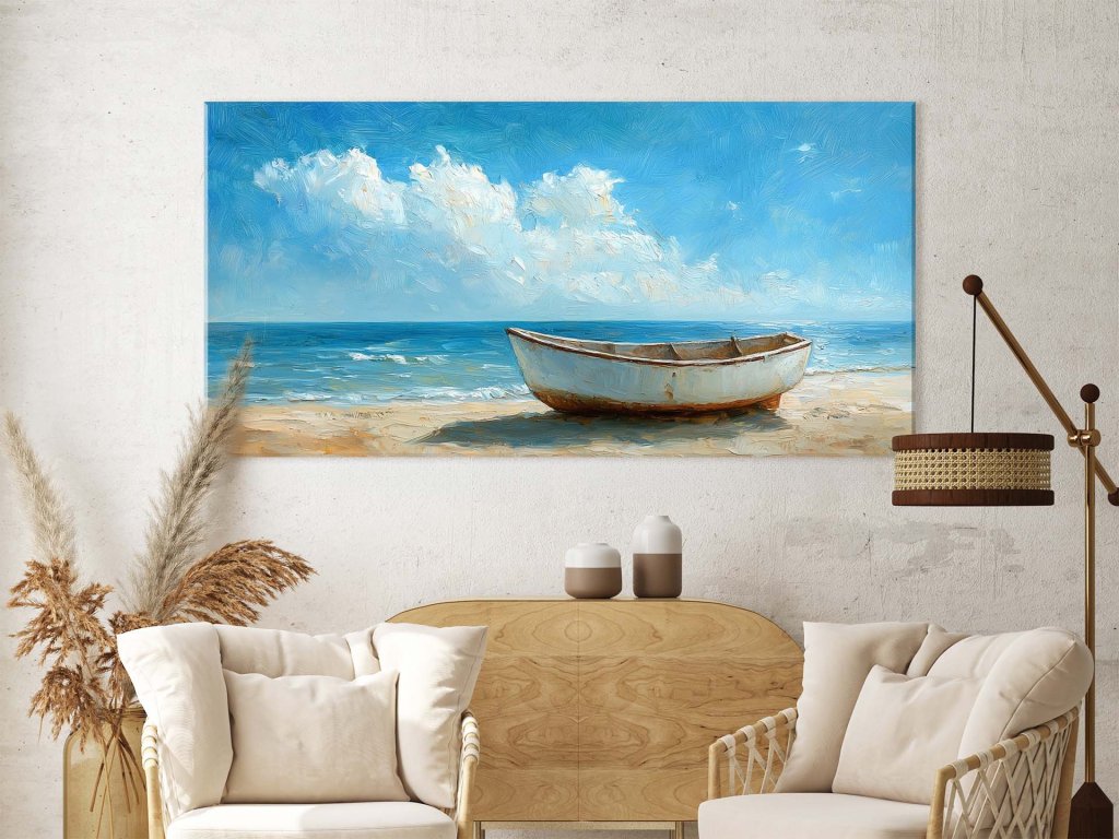 Tento obraz zachytáva scénu pokojnej pláže s opustenou loďkou na pobreží, obklopenou jasnou modrou oblohou a bielymi oblakmi. Farby a textúry zdôrazňujú pocit ticha a kľudu, ktorý vyžaruje z tejto opustenej loďky, akoby čakala na ďalšiu plavbu. Príroda a jednoduchá prítomnosť loďky vytvárajú atmosféru pokoja a oddychu.