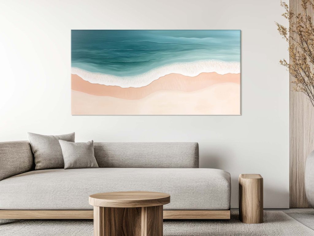 Tento obraz zachytáva minimalistické a upokojujúce stvárnenie morského pobrežia. Modrozelené tóny vody sa prelínajú s béžovým pieskom, pričom biela pena vĺn vytvára nežný prechod medzi morom a plážou. Vizuálny efekt evokuje pokoj, oddych a jednoduchosť prírodnej krásy.