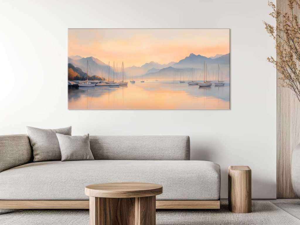 Tento obraz zachytáva pokojný ranný výjav v zátoke, kde sa jachty jemne kolíšu na pokojnej hladine vody. V pozadí sa týčia jemne zahmlené siluety horských masívov, zaliate teplým odtieňom vychádzajúceho slnka. Svetlo sa odráža na hladine a vytvára idylickú a harmonickú atmosféru úplného pokoja.