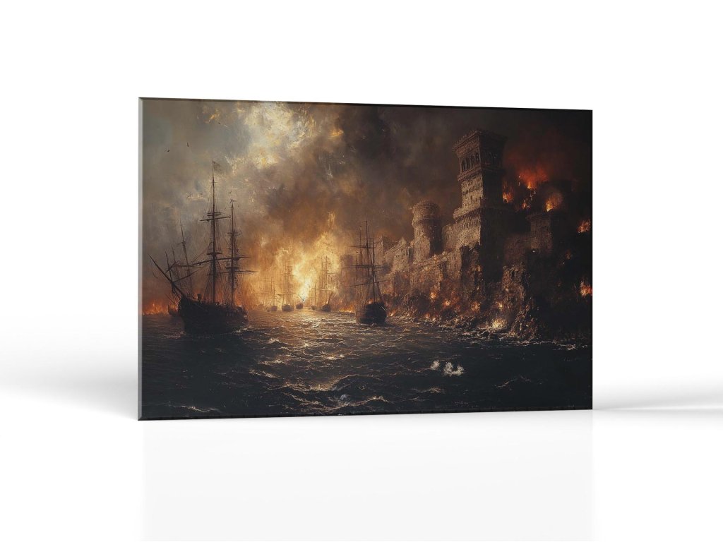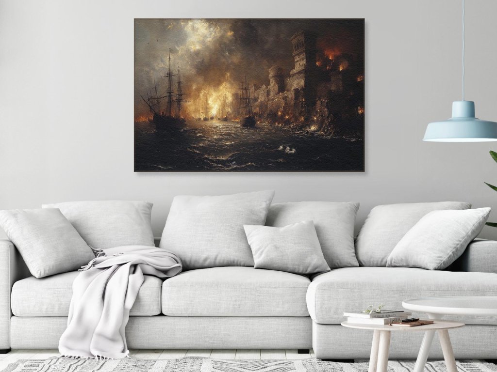 Obraz zachytáva dramatický moment s loďami a budovami zachvátenými plameňmi. Mesiac na oblohe vrhá jemné biele svetlo cez husté čierne mračná dymu stúpajúcemu k oblohe. Temná voda odzrkadľuje plamene a svetlo, čím vytvára silný kontrast medzi svetlom a temnotou.