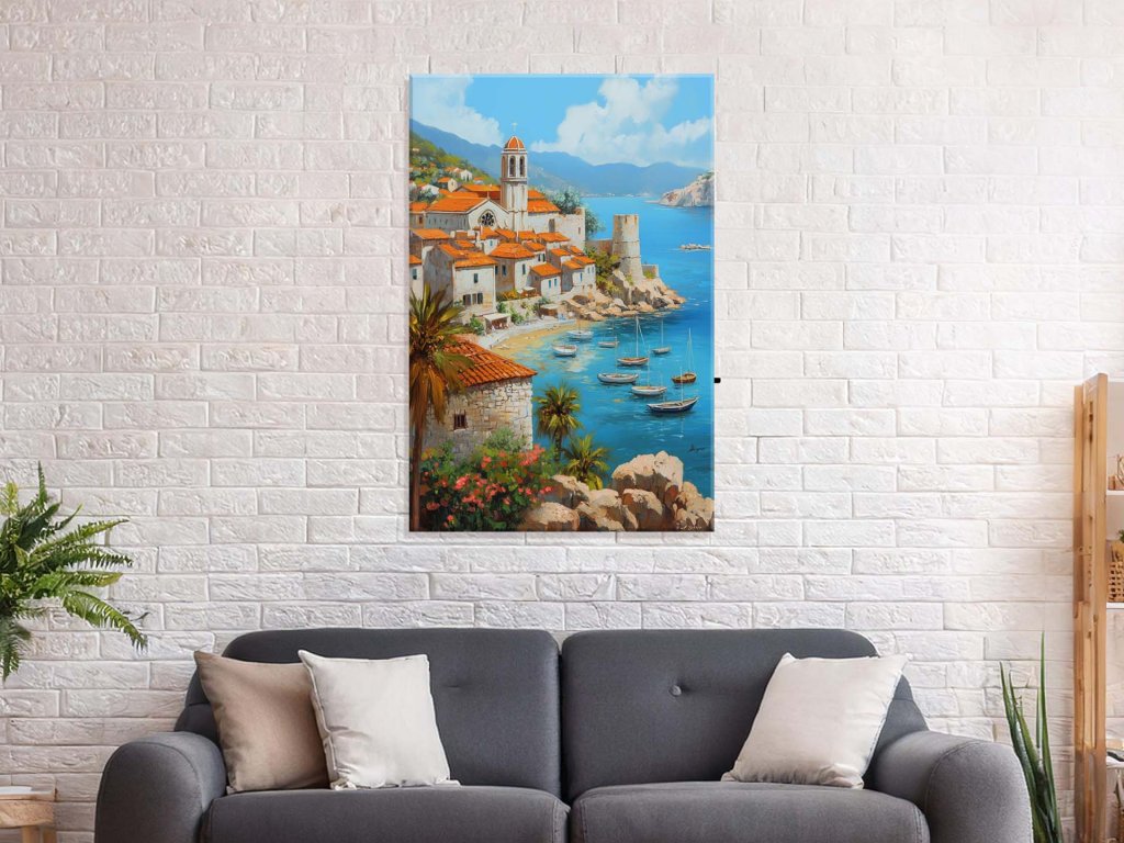 Obraz zachytávajúci malebné prímorské mestečko s tradičnými kamennými domami, ktoré zdobia červené strechy. V popredí sú palmy a farebné kvety, ktoré oživujú celkovú scenériu, zatiaľ čo tyrkysové more jemne kolíše člny na hladine. Pokojná atmosféra miesta evokuje letnú idylu a krásu historickej architektúry pri pobreží.